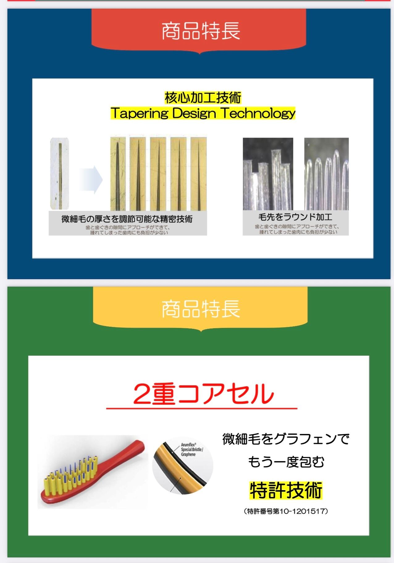 新素材の誕生グラフィン毛 新素材グラフェン&超微細毛 スマイズのグラフェン歯ブラシ毛は二重構造で開発された新素材です。 柔らかく優れたハリ感のある歯ブラシの毛を感じることができます。