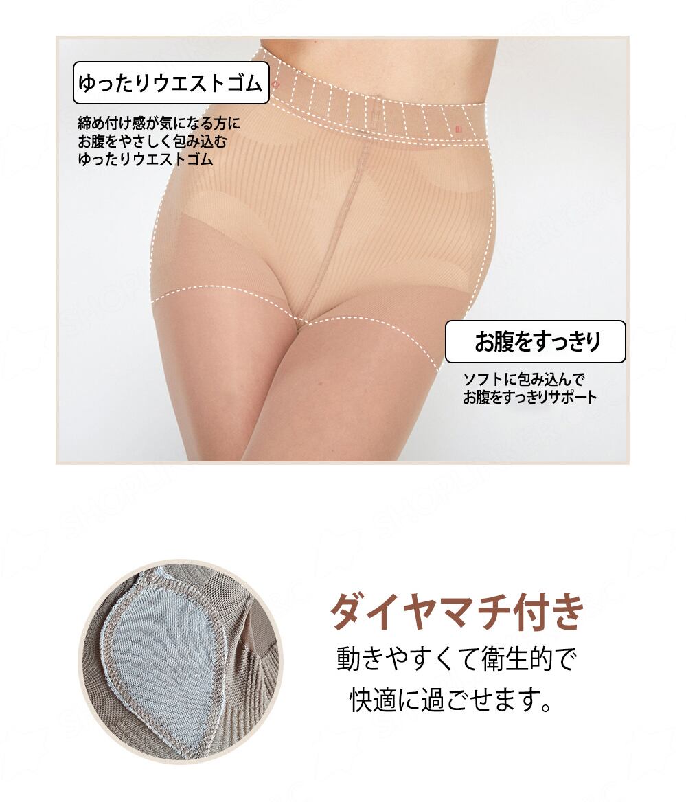 ゆったりウエストゴムでありながら、お腹をソフトに包み込みすっきりサポート付き。フィット感はありながら心地よい履き心地を提供します。